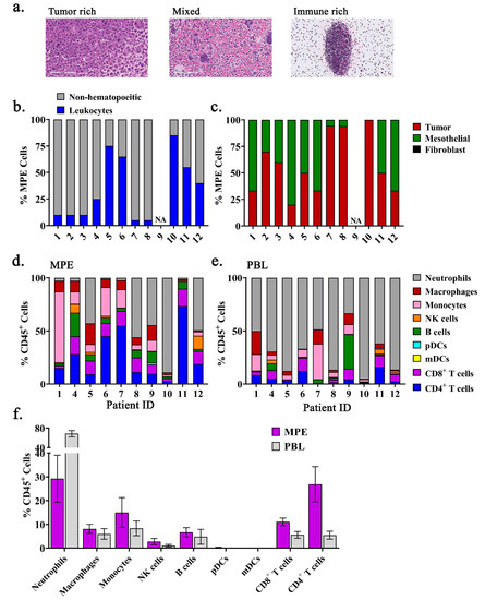 Immunophenotyping reveals heterogeneous composition of MPEs. (a) Representative images depicting MPEs rich in tumor cells, immune cells, or a mix of both within cytopathologic specimens. (b) Proportions of non-hematopoietic cells and leukocytes in MPEs, and (c) representation of tumor cells, mesothelial cells, and fibroblasts (absent) in the non-hematopoietic cell fraction of MPEs. Proportions of neutrophils (grey), macrophages (red), monocytes (pink), NK cells (orange), B cells (green), pDCs (light blue), mDCs (yellow), CD8+ T cells (purple), and CD4+ T cells (dark blue) from live, single, CD45+ leukocytes from (d) MPEs or (e) peripheral blood leukocytes (PBL) per patient were determined by multiparametric flow cytometry. (f) Population means ± SEM of immune cell subsets within MPEs and PBL.