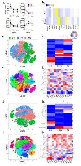 Because the T cell compartment within MPEs is comprised of diverse memory subsets and functional states, we employed computational analysis for unbiased identification of unique subpopulations. Compiled T cell culture data from all patients and timepoints was used to generate t-SNE plots for data reduction and illustration. When analyzed with Rphenograph in Cytofkit [25], T cells at 24 h (green), 7 days (blue), or 11–14 days (red) separate into distinct groups irrespective of treatment conditions, demonstrating the impact of prolonged culture (Figure 3c,d,g,h). T cell cultures treated with IL-2 or IL-2 plus anti-CD3/CD28 activating microbeads segregated into 17 and 19 unique subpopulations, respectively (Figure 3e,f,i,j). In T cells cultured with IL-2 alone, there was enrichment of clusters 10, 16, 6, and 2 at 24 h (10, 16, 6, 2), but this changed at day 7 when it was clusters 3, 9, 5, and 13. At day 11–14, clusters 1 and 15 become prominent and clusters 5 and13 were conserved from day 7 (Figure 3d). Although each subpopulation is unique (Figure 3f,j), longitudinal culture results in progressive T cell alterations. There are early reductions in CD45RA, TIGIT, and LAG-3 but increased ICOS, OX40, and 4-1BB, followed by reductions in ICOS and 4-1BB. Similarly, IL-2 plus anti-CD3/CD28 activating microbeads results in the loss of clusters 3,10, 11 and 18 at 24 h but enrichment of clusters 8 and 16 after (Figure 3h). This progression is marked by early increased expression of CD95, TIM-3, and OX40 with decreased expression of CD45RA and CD40L, followed by loss of CD40L.