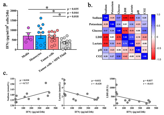 We next sought to examine the effect of the acellular component of MPE fluid on T cell function. MPE-resident CD8+ T cells were isolated and activated with anti-CD3/CD28 microbeads in the presence of IL-2, resulting in robust IFNγ production as detected by specific ELISA (Figure 4a). Co-culture of activated MPE-resident CD8+ T cells with autologous monocytes or tumor containing non-hematopoietic MPE cells did not affect IFNγ production. Notably, the anti-CD3/CD28 activated co-cultures plus 50% autologous acellular MPE fluid resulted in a significant reduction in IFNγ production (p = 0.018; Figure 4a). To investigate the acellular component of MPEs, cell-free MPE fluid was analyzed for sodium, potassium, glucose, LDH, lactate, pH, and CO2 (Table 3). There were increased levels of LDH, lactate, and glucose; reduced levels of CO2; and a basic pH when compared to normal reference values in serum. Levels of sodium within the MPE inversely correlated with both lactate and LDH (Figure 4b). We also examined the relationship between these factors and IFNγ production in these co-cultures. Interestingly, there was a positive correlation between CD8+ T cell production of IFNγ and sodium (p = 0.010) but an inverse correlation with lactate (p = 0.032) and LDH (p = 0.037; Figure 4c). These findings suggest that soluble components of the MPEs may suppress endogenous T cell function.