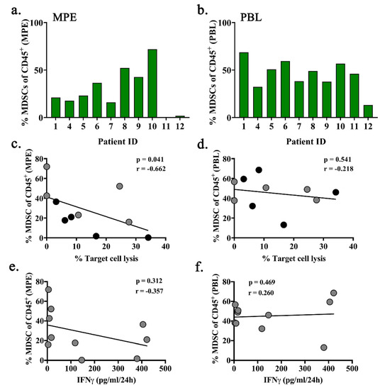 Because immune composition may influence MPE-resident CD8+ T cell activity even after being removed from their proximity, we analyzed correlations with the previously described immune populations (Figure 1) as well as regulatory T cells (Tregs), tumor-associated macrophages (TAMs), and myeloid derived suppressor cells (MDSCs). MPE-resident CD8+ T cells were co-cultured with autologous monocyte or tumor containing non-hematopoietic cells after 24-h incubation in IL-2 or IL-2 plus anti-CD3/CD28 activating microbeads. LDH cytotoxicity and IFNγ production were measured. The proportion of total MDSCs (including both M-MDSC (MHCIILowCD11b+CD66b+CD14+) and PMN-MDSC (MHCIILowCD11b+CD66b+CD15+)) in the MPEs was associated with decreased target cell lysis (p = 0.041; Figure 5a,c). By contrast, there was no correlation with the percentage of MDSCs in peripheral blood (p = 0.541; Figure 5b,d). There was also no correlation between percent MDSC in either MPE or peripheral blood and IFNγ production (Figure 5e,f). None of the remaining 11 leukocyte populations correlated with T cell function.