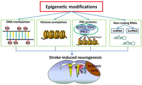 Epigenetics is the study of heritable changes in gene function that cannot be attributed to DNA sequence variations. Epigenetic mechanisms can regulate different physiological processes that occur in a living organism, including cellular proliferation and differentiation. A deeper knowledge of the epigenetic modifications related to stroke and its risk factors could provide the basis for the development of innovative approaches in the prevention and treatment of this disabling disease. In the last decade, evidence has emerged supporting the involvement of epigenetic mechanisms in many neurodegenerative diseases and stroke [24,25,26]. In this review article, we describe the different types of epigenetic mechanisms and their involvement in the pathogenesis of stroke-induced neurogenesis.