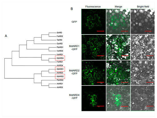The MdARD proteins were expressed driven by a 35S promoter. The subcellular localization of GFP and MdARD-GFP proteins was examined by confocal microscopy. As shown in Figure 1B, the 35S-driven GFP protein showed expression throughout cell, and MdARD protein after fusion with GFP also showed expression throughout the cell.