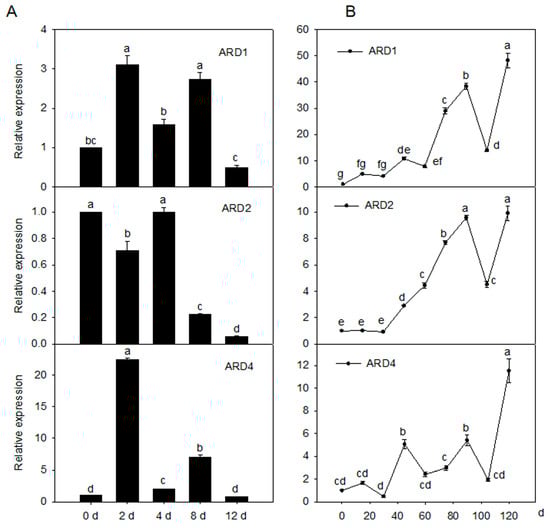 The expression pattern of MdARDs. (A) Change in the relative transcript level of MdARDs in response to the cold treatment, the expression level of MdARD1, MdARD2, or MdARD4 in response to cold on Day 0 was set as 1 and (B) trends in relative expression of MdARDs at different developmental stages of the apple fruit. Samples from 0 days after bloom (DAB) were set to 1. Expression levels were calculated relative to that of ELONGATION FACTOR1α (EF-1α). Bars represent the mean value ± SE (n ≥ 3). Different letters indicate significant differences of MdARDs expression level on the different day of treatments, according to one-way ANOVA Tukey’s multiple range tests (p < 0.05).