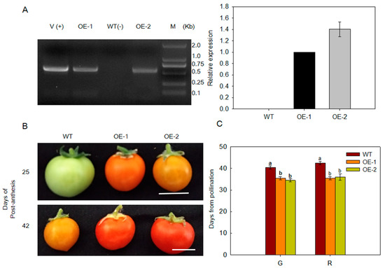 (A) PCR confirmation for transgenic tomato plants. Left panel: PCR with DNA; lanes: M, molecular marker DL2000; V(+), positive vector containing pCambia2300-MdARD4 plasmid; WT(−), non-transformed wild type; OE-1 and OE-2, MdARD4 transgenic tomato lines; Right panel: Quantitative RT-PCR analysis of MdARD4 expression in leaves of WT and MdARD4 transgenic lines OE-1 and OE-2, the expression level of MdARD4 in line OE-1 was set as 1; (B) phenotype comparisons between WT and MdARD4 transgenic fruits. Bar, 2 cm; and (C) days from pollination to green (G) and red (R) stages. Data are means of three replicates with SD. Different letters indicate significant differences between WT and MdARD4 transgenic plants on the same day of different treatments, according to one-way ANOVA Tukey’s multiple range tests (p < 0.05).