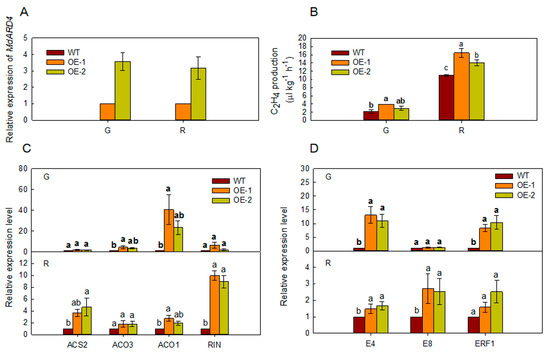 At the maturation stages corresponding to green and red fruit stages of tomato, ARD4 relative expression level and ethylene release were higher in transgenic tomato fruits than those in WT fruits (Figure 4A,B). The expression levels of ethylene biosynthetic genes (ACS2, ACO3, ACO1, and RIN) and ethylene-responsive genes (E4, E8, and ERF1) were more also higher in MdARD4 transgenic tomato fruits than those in WT fruits (Figure 4C,D).