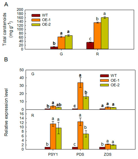 The color of transgenic tomato fruits differed from that of WT fruits at the same stage of maturation. Carotenoid concentration was higher in transgenic tomato fruits compared to that in WT fruits (Figure 5A). The expression of carotenoid biosynthetic genes (PSY1, PDS, and ZDS) was higher in the fruits of transgenic tomato (Figure 5B).