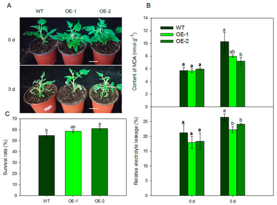 Effects of MdARD4 overexpression in tomato on the degree of plant damage under cold conditions. (A) Phenotype comparisons between WT and MdARD4 transgenic plants. Bar, 5 cm; (B) relative electrolyte leakage and MDA concentrations of WT and MdARD4-overexpression plants; and (C) survival rates of WT and MdARD4-overexpression plants. Data are means of three replicates with SD. Different letters indicate significant differences between WT and transgenic plants on the same day of different treatments, according to one-way ANOVA Tukey’s multiple range tests (p < 0.05).