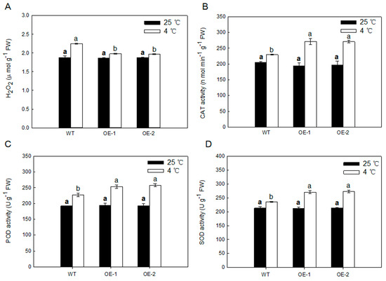 Stress-induced accumulation of highly toxic reactive oxygen species (ROS) can lead to oxidative stress, which damages various cell components. We monitored H2O2 levels of transgenic and WT plants leaves under both normal temperature and low temperature conditions. As shown in Figure 7, there were no visible differences in any parameter for any genotype grown under normal temperature conditions. However, after 5 days of 4 °C low temperature, transgenic plants showed significantly lesser H2O2 concentration compared with the WT plants (Figure 7A). There were no obvious differences in the antioxidant enzyme (SOD, CAT, and POD) involved in scavenging H2O2 activities in any genotype grown under normal temperature conditions, while the activities in transgenic plants were obviously more than that in the WT (Figure 7B–D). These results suggested that overexpressing MdARD4 activates the antioxidant system under cold conditions.
