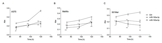 The ectopic over-expression of miR-193a-3p and miR-193a-5p at 10 nM in the three melanoma cell lines: A375 (ATCC® Manassas, VA, USA CRL-1619, from primary cutaneous melanoma), MeWo (ATCC® HTB-65, from lymph nodal cutaneous melanoma metastasis) and 501Mel (from not better specified metastatic cutaneous melanoma) caused a significant time-dependent inhibition of cell viability, compared to the correspondent scrambled miRNA transfected cells.