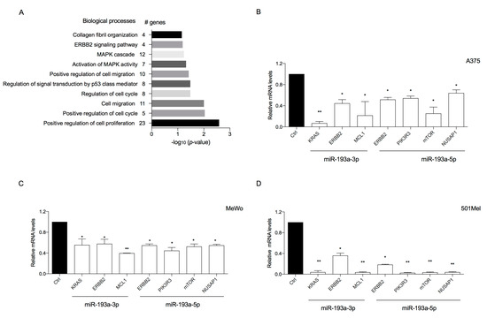 (A) Putative biological processes associated with target genes that can be negatively affected by ectopic over-expression of miR-193a-3p and -5p, as identified using DAVID analysis. (B–D) Ectopic over-expression of miR-193a arms reduces target genes in A375 (B), MeWo (C), and 501Mel (D). The expression of direct targets of miR-193a-3p (KRAS, EBBB2, and MCL1) or -5p (PIK3R3, MTOR, and NUSAP1) in melanoma cell lines following transfection with miR-193a-3p or -5p was measured by RT-qPCR. Data are normalized to β-actin and control mimic-transfected cells. Data are representative of three independent experiments ± SD performed in triplicate. Statistical analysis was performed using Student’s t-test (* p < 0.5, ** p < 0.01, compared to the corresponding control.)