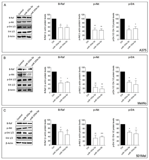 Extracellular signal-regulated kinases (Erk) and Akt signaling are often aberrantly activated in melanoma cells, inducing cell proliferation and survival. Therefore, we analyzed the ability of miR-193a arms to modulate the protein expression level of B-Raf and the phosphorylation levels of Erk 1/2 and Akt 1/2/3.