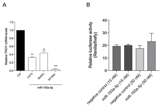 (A) Ectopic over-expression of miR-193a-5p reduces TROY transcriptional expression levels in A375, MeWo, and 501Mel cells. Data are representative of three independent experiments ± SD performed in triplicate. Statistical analysis was performed by Student’s t-test (** p < 0.01, *** p < 0.001, compared to corresponding control). (B) Luciferase assay analysis for miR-193a-5p and TROY mRNA 3′-UTR interaction. Luciferase assay signal did not show any downregulation by miR-193a-5p compared to the negative control.