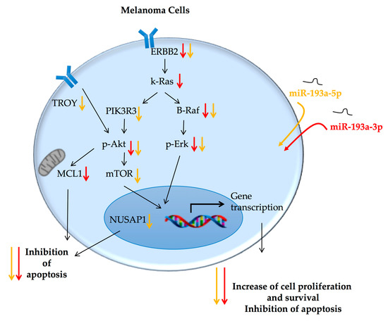 In detail, a strong down-modulation of several cancer hallmarks strictly involved in melanoma development and progression was observed following ectopic over-expression of miR-193a, including pro-proliferative molecules and anti-apoptotic factors, previously validated as direct targets of miR-193a [41,42,63,64,65,66]. In particular, they strongly downregulated ERBB2, an epidermal growth factor receptor (EGFR), targeted by both miR-193a arms [40,46,47]. This molecule is frequently over-expressed in various cancers where it promotes an uncontrolled cellular proliferation by the activation of several effectors [67]. Among these downstream effectors, there are other molecules targeted by miR-193a-3p or miR-193a-5p: KRAS, a target of miR-193a-3p [45], and PIK3R3 and mTOR, targets of miR-193a-5p [21], which are all proteins stimulating proliferation, cell cycle progression, and cell survival in cancer cells [68,69]. Furthermore, the ectopic over-expression of each miR-193a arm induced a significant decrease of anti-apoptotic factors. In detail, the expression of MCL-1, a member of the Bcl2 family which promotes cell survival [70], was affected by miR-193a-3p [49,50], while miR-193a-5p decreased the expression of NUSAP-1 [48], a microtubule-associated protein controlling cell proliferation by governing spindle assembly, chromosome segregation, and cytokinesis, whose decrease leads to apoptosis [71].