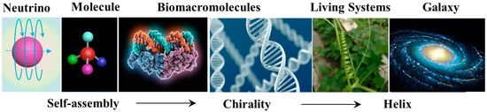 Chirality is ubiquitous and can be observed at various hierarchical levels from subatomic and molecular to supramolecular and macroscopic scales [1,2,3]. As chiral phenomena widely exist in nature (such as the D-sugars as the main components of DNA and the secondary R-helix structure of proteins) and various artificial and biomimetic systems [4,5], they are very important not only for fundamental sciences but also for practical applications in many areas, such as molecular and chiral recognition [6], chiral sensors [2], chiroptical switches [7] and asymmetric catalysis [8]. The studies of chirality in terms of mechanisms and superstructures have always attracted significant attention from scientists. Indeed, from the understanding of chirality phenomena in natural systems to the increasing application to artificial intelligence systems, subjects related to chirality will clearly become more developed and provide broader guidance for academic research and industrial application [9,10,11].