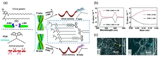 (a) Illustration of chiral transfer from gelator to achiral polymer. (b) CD spectra of the supramolecular chiral co-gels. (c) SEM images of the helical fibers. (Reproduced from [79] with permission from The Royal Society of Chemistry).