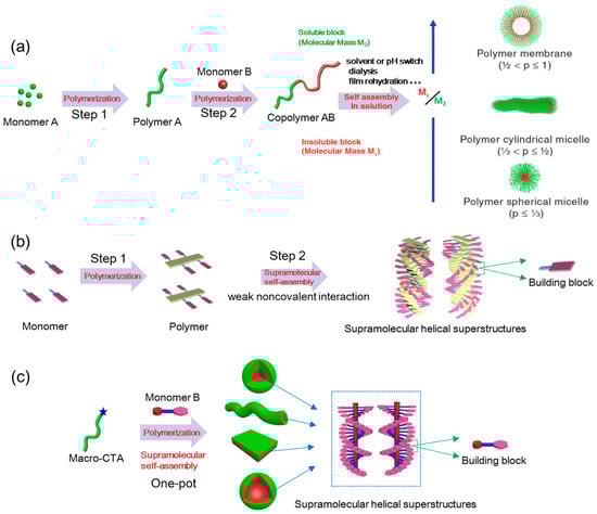 Self-assembly process involves “spontaneously” creating significantly ordered structures or patterns from disordered or homogeneous components. Nanostructures self-assembled by molecular or polymeric building blocks is ubiquitous in nature, with examples including DNA double helix and complex hierarchical structures of protein [97]. In the past few years, assemblies with multiple morphologies have found wide application in catalysis [98], nanoreactors [99], biomineralization [100], and drug delivery [101]. Traditional processes for generating polymer assemblies first requires the synthesis of polymers followed by assembly either by solvent or pH switch, dialysis, or film rehydration (Figure 4a) [102]. This method is called postpolymerization self-assembly, which has been widely studied by Eisenberg’s group [27,103,104,105]. Nevertheless, such protocols involve multiple steps and are typically conducted at highly diluted concentrations (≤ 1 wt% is common), which is difficult to implement on a large scale for industrial purposes. Furthermore, the process of supramolecular self-assembly in polymer systems is very fascinating but challenging due to the complexity of the components and interactions. Supramolecular self-assembly in polymer system can be defined as the spontaneous formation of organized structures from building blocks with the aid of weak noncovalent forces such as hydrophobic or solvophobic effect, π-π stacking, hydrogen bonding, electrostatic interactions and coordination interactions (Figure 4b) [29,106,107]. Previously, the processes and steps for obtaining supramolecular self-assemblies in polymer systems are similar to traditional postpolymerization self-assembly, in other words, the polymer needs to be synthesized before the self-assembly process. However, this strategy to produce supramolecular chiral assemblies in solution usually requires a relatively complex system consisting of the good solvent, poor solvent and chiral solvent, which can be very tedious. Hence, it is necessary to explore a more efficient and powerful synthetic methodology for precise and large-scale preparation of supramolecular assemblies.