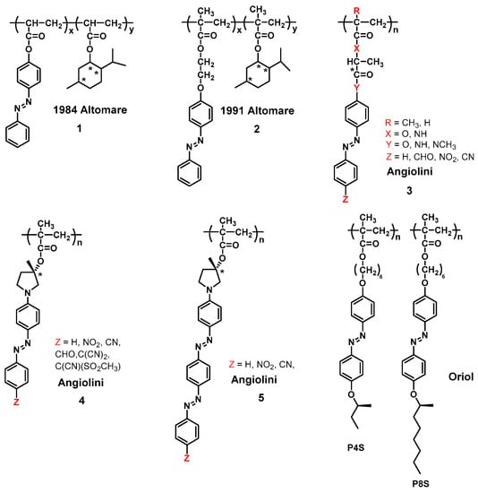 Angiolini et al. has reported many detailed studies on the mechanisms and chiroptical properties of Azo-polymer derivatives 3 based on chiral Azo monomers in dissolved state since 1998 [141,142,143,144,145]. The detection of chiroptical properties in chloroform solution suggested that the macromolecules existed in a conformational arrangement with a significant prevalence of one single chirality. This is caused by the effect of the stereogenic center on the growth of the polymer chain. In addition, significant changes in optical activity were also observed when other types of solvent (such as methanol) were added to the chloroform solution, thus suggesting the disturbance of a helical chiral macromolecular conformation in the polymeric backbone. Further investigations of chiral Azo-polymers in dissolved state have been reported by the same group [143,146,147,148,149,150]. In 1999, they described the syntheses and characterizations of new optically active Azo-polymer derivatives 4 containing a (S)-3-hydroxypyrrolidinyl group in solution [143]. CD and UV-vis spectra suggested that the presence of chirality in the Azo-polymers derived from conformational dissymmetry of the macromolecules and dipole-dipole interactions between the side-chain Azo chromophores. It should be noted that these works are preliminary explorations of chirality on the side-chain Azo-polymers in solution, which involves the ordered arrangement of azoaromatic chromophores in a helical geometry with one prevailing chirality. The Azo-polymer derivatives 5 also showed optical activity as demonstrated by the presence of strong exciton couplets in the CD spectra, with a mechanism similar to Azo-polymer derivatives 4 [151,152,153]. These fascinating works indicate that, in addition to the asymmetric chiral center present in the side group, the helical chirality of the Azo-polymer backbone can also be constructed in solution when the chiral center is close to the methacrylate main chain. Moreover, the helical structures of polymer backbones with predominantly one-handed screw sense in solution can be built directly by connecting the chiral Azo side chains to the backbone, as shown in 1,4-polyketones [154] and helical polyisocyanates systems [155,156].