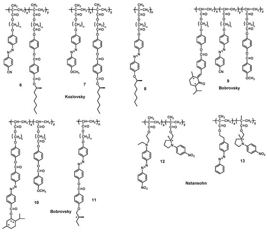 - Bobrovsky, A.; Shibaev, V.; Hamplová, V.; Kašpar, M.; Glogarová, M. Chirooptical and photooptical properties of a novel side-chain azobenzene-containing LC polymer. Monatsh. Chem. 2009, 140, 789–799. [Google Scholar] [CrossRef]