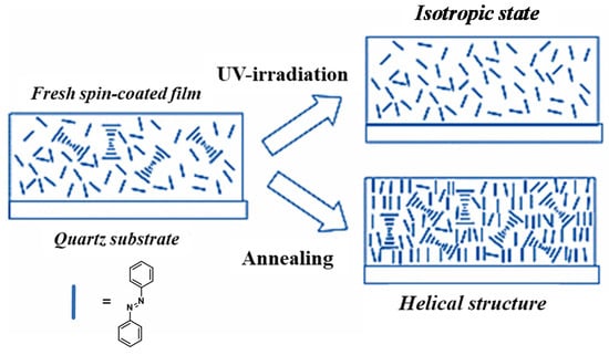 Idealized scheme of photoinduced and thermoinduced structural changes in the spin-coated film of the chiral Azo-polymer 11.
