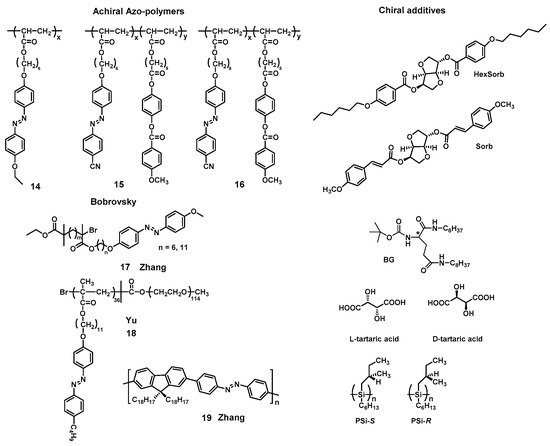 The chemical structures of achiral Azo-polymers 14, 15, 16, 17, 18, 19 and chiral additives.