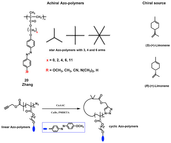 The chemical structures of achiral Azo-polymers based on Azo-polymer 20 and chiral limonene. (x represents different spacer lengths; R represents different substituents).