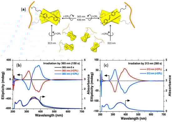 Proposed scheme of twisted stack led by wavelength-dependent (a) l- and r-CPL sources. CD and UV-vis spectra of Azo-polymer 20 aggregates exposed to (b) 365 nm and (c) 313 nm l-CPL and r-CPL. (Reprinted with permission from [231]; Copyright (2017) American Chemical Society).