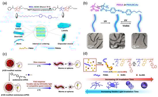 Schematic representation of Azo-polymer assemblies and morphological transition constructed by PISA strategy. (For (a–d), Reprinted with permission from [232,233,234,235]; Copyright (2018, 2019, 2017, 2018) American Chemical Society).