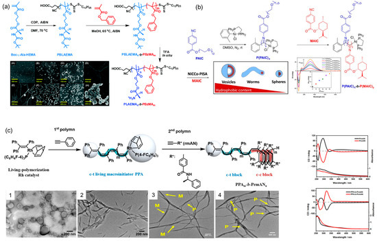 Chiral or helical polymeric supramolecular nanostructures have been extensively studied by researchers through traditional postpolymerization self-assembly method. However, few examples have been demonstrated for the construction of chiral polymer assemblies during the polymerization process. Until 2015, De et al. reported PISA of benzyl methacrylate (BzMA) using macro-CTA containing chiral side-chain amino acid as a solvophilic steric stabilizer, which allowed amphiphilic copolymers to self-assemble in situ into chiral nanostructures including spheres, worms, twisted fibers and vesicles, depending on the targeted block composition and the copolymer concentration (Figure 15a) [109]. Chirality transfer from the molecular level to the macromolecular level, and then to the supramolecular assemblies was observed by CD spectra and SEM images. The mechanism for such chirality transfer and twisted morphologies may be ascribed to hydrogen bonding between the side-chain chiral amino acids. To this end, main-chain helical assemblies have been constructed by PISA but the mechanism is distinctly different from that of supramolecular chirality in polymer side chains. In 2020, O’Reilly et al. presented a facile and tunable one-pot methodology, termed nickel-catalyzed coordination PISA (NiCCO-PISA) [238], to construct helical poly(aryl isocyanide)s in situ (Figure 15b). Various chiral superstructure morphologies, such as spheres, worms and vesicles, were constructed simultaneously during the process of polymerization. The helicity of the assemblies was detected via CD spectroscopy for all morphologies, proving the helical nature of their main chain formed in PISA process. Furthermore, Wan et al. recently reported that PISA strategy can also be employed to prepare main-chain helical assemblies of conjugated poly(phenylacetylene)s [239], which can self-assemble spontaneously into vesicles, lamellae and helical ribbons with the increase of core-forming blocks length (Figure 15c). The chiral properties and the formation of primary helices as main-chain twisted stacks were investigated by TEM and further confirmed by CD data. The results indicated that molecular chirality could be accurately transferred to the one-handed helical backbone of macromolecules, and then to the assemblies. These works not only expanded applications of PISA into conjugated polymers but also enhanced the preparation efficiency of chiral assemblies in situ.