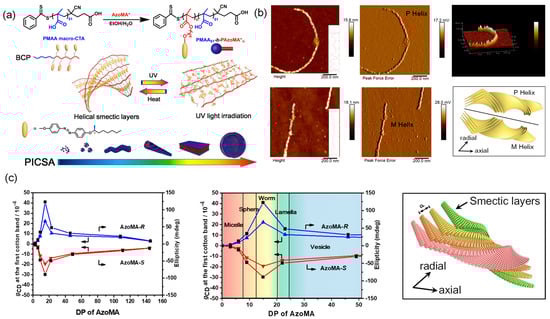 Self-assembly has been widely employed in constructing supramolecular assemblies of Azo-polymers. Azo-polymers are very promising in the field of reversible photo-switchable materials [33,34,35]. With external stimuli, the Azo units in supramolecular Azo-polymers can dramatically change their polarity, shape, and sizes, which can be easily detected by UV-vis and circular dichroism (CD) spectroscopies. As a result, these polymers have found great applications in stimuli-responsive chiroptical switches [36]. In this review, we intend to discuss the supramolecular chirality of Azo-polymer systems, constructed by traditional postpolymerization self-assembly and PISA-mediated in situ supramolecular self-assembly strategies, for the consideration of successfully understanding and applying supramolecular chirality in stimulus-responsive materials. First, we will present an introduction to the basic concepts of supramolecular chirality based on Azo-polymers, along with some commonly used characterization techniques to examine and understand these supramolecular systems. Then, we will summarize the seminal studies and recent developments in the constructions and applications of supramolecular chirality based on Azo-polymers. Finally, we will focus on the perspective of current limitations along with future opportunities for the further advancement of supramolecular chirality in Azo-polymers.