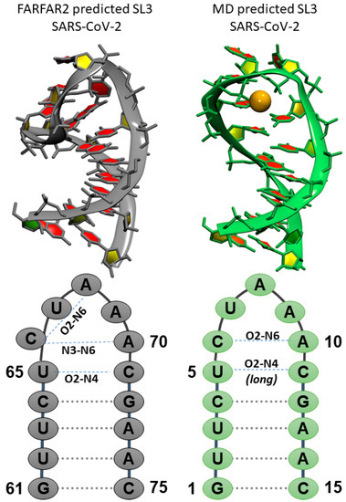 - Lee, C.W.; Li, L.; Giedroc, D.P. The solution structure of coronaviral stem-loop 2 (SL2) reveals a canonical CUYG tetraloop fold. FEBS Lett. 2011, 585, 1049–1053. [Google Scholar] [CrossRef]
