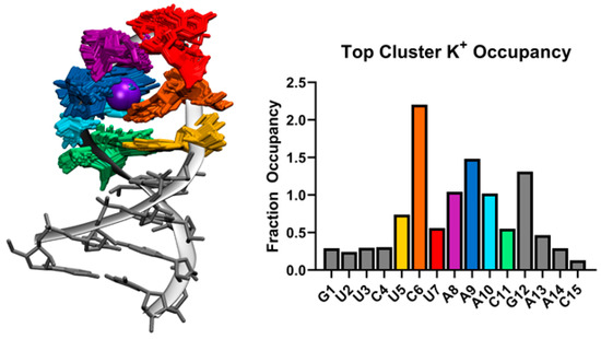 At the center top of the SL3 seven-membered loop predicted by MD simulation, a K+ ion coordinates residues C6, A8, A9, and A10. Figure 4 shows the overlap of 100 frames from the top cluster with K+ ion density at 80% occupancy. The bar graph in Figure 4 shows the Fraction Occupancy by residue for SL3. Specifically, coordination with K+ occurs through contacts with C6 O2 and N3, A8 and A9 phosphate oxygen OP2, and A9 N7 atoms in this binding site. Measurements of the closest K+ ions to the binding site ions show exchanges between bound ions and free ions in solution (Supplementary Materials Figure S9).