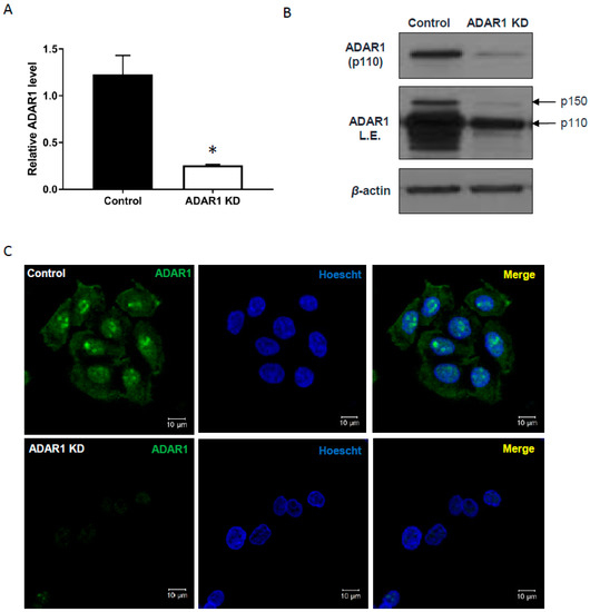 To stably knockdown ADAR1 in AGS cells (ADAR1 KD), cells were infected with a lentivirus encoding an ADAR1 shRNA, as was previously described [18]. First, HEK-293T cells were plated at a density of 1.5 × 105 cells/well in a six-well plate and incubated for 24 h. Subsequently, HEK-293T cells were co-transfected with an shADAR1 plasmid (TRCN0000050788, sequence: CCGGGCCCACTGTTATCTTCACTTTCTCGAGAAAGTGAAGATAACAGTGGGCTTTTTG, 1500 ng; Sigma, St. Louis, MO, USA,) with the packaging mix of psPAX2 (700 ng) and the envelope plasmid pMD2.G (700 ng), using Lipofectamine 2000 (Invitrogen, Carlsbad, CA, USA). Viral supernatants were then harvested at 24–48 h after transfection and were used to infect AGS cells. For interferon treatment experiments, we used an inducible ADAR1 knockdown system using the shADAR1 plasmid (TRCN0000050788) cloned into pLKO Tet-on vector, which conditionally knocks down ADAR1 by doxycycline treatment at 1 μg/mL. Using this method, ADAR1 level was stably suppressed in ADAR1 KD cells even in the presence of IFN.