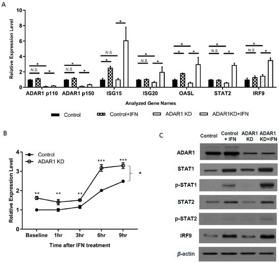 Multiple reports have shown the suppressive role of ADAR1 on IFN signaling [19,20]. We, therefore, started by validating the IFN response of control and ADAR1 KD cells. In the absence of IFN stimuli, RNA levels of most ISGs were not altered or slightly decreased (Figure 2a; * p < 0.05; N.S., Not Significant) in ADAR1 KD cells, except for IRF9 and STAT1, which showed a significant increase (Figure 2a,b; ** p < 0.01, *** p < 0.001). As expected, IFN treatment significantly increased the RNA expression of all tested ISGs in ADAR1 KD cells (Figure 2a). We also found that the level of STAT1 mRNA was dynamically upregulated after 1–9 h of IFN treatment in ADAR1 KD cells (Figure 2b; p = 0.049, ANOVA test). Consistently, immunoblot confirmed that the protein levels of STAT1, p-STAT1, and IRF9 were further increased upon the knockdown of ADAR1 in the presence of IFN (Figure 2c, Supplementary Figure S2 for quantitation).
