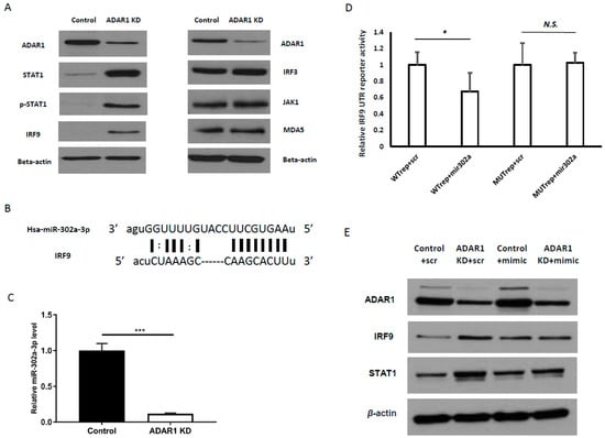 Considering the non-canonical activation of IRF9/STAT1 (shown in Figure 3a) as well as the discrepancy between qRT-PCR (less than 2-fold change) in Figure 2b and immunoblot results in Figure 2c, we speculated that ADAR1 affects the post-transcriptional regulation of IRF9 and STAT1 protein levels. Since our previous study revealed that miR-302a-3p and miR-302-5p were the most decreased miRNAs upon ADAR1 knockdown [18], we first examined whether miR-302a-3p could post-transcriptionally regulate IRF9. Indeed, the seed sequence of miR-302a-3p matched with the 3′-UTR of IRF9 (Figure 3b). In addition, by real-time PCR, we confirmed that the knockdown of ADAR1 decreased miR-302a-3p level (Figure 3c; *** p < 0.001). As the mRNA and protein levels of IRF9 were increased in the ADAR1-depleted sample (Figure 2a,c), we speculated that suppression by miR-302a-3p might have been mitigated. To prove this idea, we generated wild-type (WT) and mutant IRF9 UTR reporters with a mutated seed-binding sequence of miR-302a-3p. In the luciferase assay, we observed a significant decrease in the WT reporter activity by an miR-302a-3p mimic, that was restored by mutagenesis of the seed-binding sequence (Figure 3d; * p < 0.05). These data indicated that miR-302a-3p suppressed IRF9 via its 3-′UTR and explained how IRF9 was increased in ADAR1-depleted cells. Consistently, the treatment of ADAR1 KD cells with the miR-302a-3p mimic attenuated the upregulation of IRF9 and STAT1 (Figure 3e, Supplementary Figure S3 for quantitation).