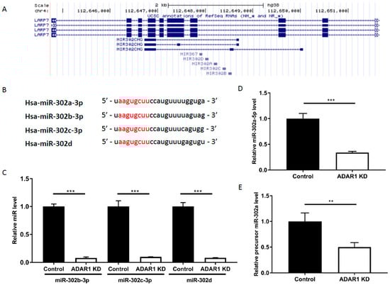 Expression of the miR-302/367 cluster is regulated upon knockdown of ADAR1. (A) Mapping of miR-302/367 cluster components on the UCSC genome browser (genome.ucsc.edu, GRCh37/hg19). (B) Comparison of sequence alignment of miR-302/367 cluster components; hsa-miR-302a-3p, hsa-miR-302b-3p, hsa-miR-302c-3p, and hsa-miR-302d share identical seed sequences (marked as red) that match the 3′-UTR of IRF9. (C) miR RT-PCR result showing reduced miR-302b-3p, miR-302c-3p, and miR-302d in ADAR1 KD cells compared with the control. (D) miR RT-PCR result showing reduced miR-302a-5p in ADAR1 KD cell line compared with the control. (E) Precursor miRNA RT-PCR result showing reduced precursor miR-302a level in ADAR1 KD cells compared with the control. ** p < 0.01, *** p < 0.001.