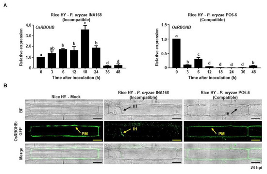 OsRBOHB- focally accumulated around invasive hyphae during incompatible rice–P. oryzae interaction. (A) Transcriptional analysis of OsRBOHB in rice leaf sheaths after inoculation with P. oryzae incompatible strain INA168 and compatible strain PO6-6. The OsRBOHB expression level was detected at different time points using quantitative real-time PCR (qRT-PCR) after normalizing with respect to the housekeeping gene Ubiquitin. The results were presented as means ± SD of relative expression levels from three independent experiments. Letters above the bars indicate significant differences in relative expression at different time points (one-way ANOVA, p < 0.05, n = 3). (B) Localization of GFP-tagged OsRBOHB in epidermal cells of rice cv. HY after inoculation with P. oryzae incompatible INA168 and compatible PO6-6. OsRBOHB:GFP fluorescence is indicated by arrows in rice cells. Scale bars = 10 µm. All images were captured using confocal laser microscopy with bright field or green fluorescence filter (488 nm excitation/505–550 nm emission). BF, bright field; IH, invasive hyphae; PM, plasma membrane.