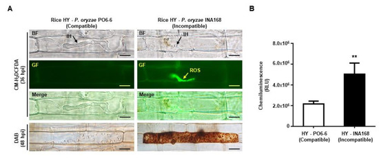 Penetration of virulent P. oryzae hyphae into rice tissue invaginates the plasma membrane, and the invading hyphae expand within the first occupied epidermal rice cell, thereby perturbing plant hormone signaling before invading surrounding cells [36,37]. To analyze ROS accumulation, ROS quantity and distribution were detected in rice cells during compatible and incompatible interactions with P. oryzae. This study used CM-H2DCFDA staining to determine the ROS distribution in living cells without damaging the cell structure (which is a potential problem with 3,3′-diaminobenzidine (DAB) staining). The green fluorescence was produced by ROS reaction with CM-H2DCFDA in plant cells, but not the autofluorescence of plant phenolic compounds or cell-wall appositions around the invasive hyphae (Figure S1). And it was concentrated around the primary invasive hyphae in HY sheath cells infected with avirulent P. oryzae INA168, whereas the DAB method uniformly stained ROS throughout infected cells (Figure 2A). Higher levels of ROS were produced in HY cells during incompatible interactions with P. oryzae INA168 than by compatible interactions with P. oryzae PO6-6 (Figure 2B). Invasive mycelial growth in rice cells infected with avirulent P. oryzae was inhibited under high ROS conditions. Avirulent P. oryzae invasive hyphae displayed growth inhibition, appearing thin and filamentous and without bulbous branches (Figure 2A and Figure S2). By contrast, no ROS was detected by DAB staining or CM-H2DCFDA staining in compatible rice cells, and invasive hyphae grew actively, developed strong bulbous hyphae, and successfully colonized infected cells and neighbor cells (Figure 2A and Figure S2). These results indicate that ROS focal accumulation around invasive hyphae has an essential role in rice immunity through growth inhibition of P. oryzae invasive hyphae.