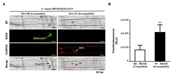 P. oryzae hyphae secrete effectors that suppress plant defense responses for successful colonization in rice cells [30,38,39]. If ROS focal accumulation inhibits P. oryzae hyphal growth and inhibits effector expression, it would be a much more effective defense mechanism. To investigate effector expression during P. oryzae infection process, the effector BAS4:eGFP was constructed and transformed into P. oryzae INA168. The BAS4:eGFP effector was normally expressed in P. oryzae invasive hyphae in compatible interaction with NB sheath epidermal cells (Figure 3A). By contrast, no fluorescence was detected in incompatible HY cells inoculated with avirulent P. oryzae INA168: BAS4:eGFP (Figure 3A).