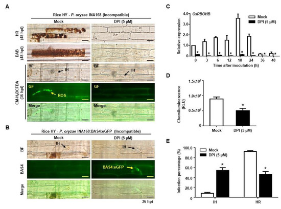 Plasma membrane–bound NADPH oxidase is a representative enzyme that rapidly generates ROS bursts and activates defense signaling during pathogen infection [18,19,32,33]. DPI suppresses ROS production by inhibiting NADPH oxidases [40,41,42]. DPI treatment significantly reduced ROS accumulation in avirulent P. oryzae-infected rice sheath epidermal cells, which confirmed that OsRBOHB-mediated ROS focal accumulation had a key role in rice defense responses (Figure 4). ROS focal accumulation around invasive hyphae occurred in incompatible rice–P. oryzae INA168 interaction at 36 hpi, but disappeared after DPI treatment (Figure 4A). As the ROS focal accumulation vanished, rice cells failed to induce normal HR responses to inhibit avirulent P. oryzae infection (Figure 4A,E). The invasive hyphae grew in normal pattern, developed multiple bulbous branches, restored effector BAS4:eGFP expression from avirulent P. oryzae INA168:BAS4:eGFP, and recovered pathogenicity (Figure 4B). DPI treatment also suppressed OsRBOHB expression in HY cells infected with avirulent P. oryzae INA168 (Figure 4C), which suppressed ROS production (Figure 4D) and disrupted ROS focal accumulation in incompatible rice cells (Figure 4A).