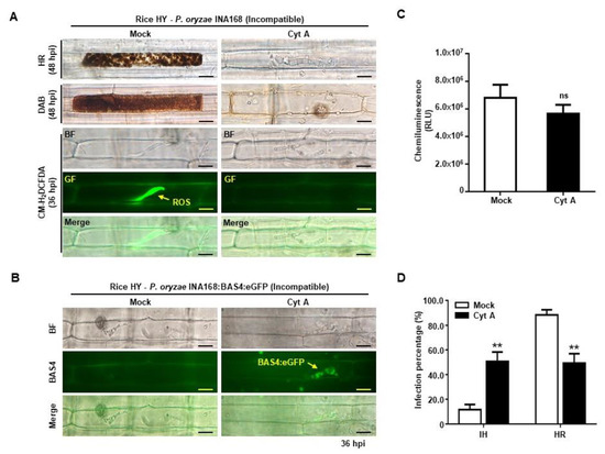 To suppress the production and focal accumulation of ROS in P. oryzae-infected rice cells, Cyt A (Cayman Chemical Company, Ann Arbor, MI, USA) and DPI (Sigma-Aldrich, St. Louis, MO, USA) treatments were performed as described previously with slight modification [20]. Briefly, 41.8 µM of Cyt A or different concentrations (1, 3, 5 µM) of DPI were mixed with the freshly harvested spore suspension (5.0 × 105 mL−1) of P. oryzae INA168. The Cyt A- or DPI-treated spores were inoculated into rice leaf sheaths (n = 4) along with untreated spores (Mock). The effects of Cyt A and DPI were observed at 48 hpi using fluorescence microscopy (Zeiss equipped with Axioplan 2; Campbell, CA, USA).