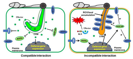 Plant pathogens have developed numerous direct and indirect effectors that suppress ROS production to maintain pathogenicity through long time coevolution [24]. Several fungal pathogens secrete extracellular catalase on the mycelial surface during host invasion, which detoxifies ROS produced by host cells [15,25]. Analysis of plant cell membranes during mycelial invasion proved that invasive hyphae penetrating the cell were sealed within extra-invasive hyphal membrane (EIHM) derived from host cell, and were not in direct contact with the intracellular matrix [26]. Previous studies showed that biotrophy-associated secreted (BAS) proteins were highly expressed during compatible interactions, but suppressed during incompatible interactions. BAS1 and BAS2 proteins accumulated in biotrophic interfacial complexes (BIC), BAS3 localized in BICs and penetration sites, and BAS4 distributed evenly along the invasive hyphae [27,28,29]. However, fungal effector secretion and translocation to plant cells remains largely unknown due to lack of functional studies. And more information should be provided to explain plant defense mechanisms on suppressing pathogen virulence.