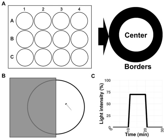 Schematic representations of the experimental setup. (A) Open field test in a 12-well plate. (B) Light/dark preference test in a 10 cm Petri dish. (C) Visual–motor response protocol.