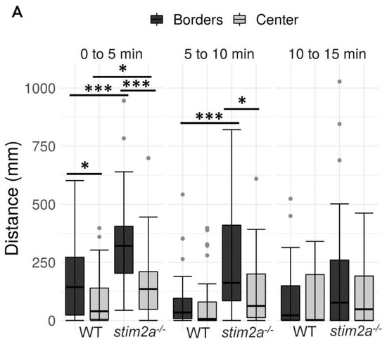 Higher thigmotaxis in stim2a−/− zebrafish in the open field test adopted for zebrafish larvae. Activity of the larvae was recorded for 15 min in a 12-well plate. The experiment was divided into three phases, 5 min each (0–5 min, 5–10 min, and 10–15 min). Fish that did not move were not included in the analysis. (A) Box plots show the distance traveled (in millimeters) in WT and stim2a−/− fish at either the edge of the well or in the center. (B) Box plots of the time spent moving (duration of movement) while swimming either at the edge of the well or in the center. (C) Box plots show the maximum acceleration (in millimeters per squared second) of WT and stim2a−/− fish in total throughout the well. (D) Heat maps show the total distance covered by the larvae in each phase of the experiment. * p < 0.05, *** p < 0.001 (paired Wilcoxon rank-sum test for comparisons between the edge and center; unpaired Wilcoxon rank-sum test for comparisons between WT and stim2a−/− mutants). n = 32 for WT larvae. n = 33 stim2a−/− larvae. Number of experiments: 3.