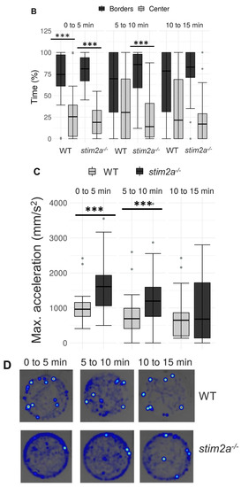 To investigate behavior in stim2a−/− fish, we evaluated thigmotaxis in the open field test using 4 dpf old larvae (Figure 3A). Thigmotaxis reflects the preference of animals for the edge of the well compared with the central area [41]. The experiment was performed for 15 min. The data analysis was divided into three phases, 5 min each. During the first phase, the animals could be assumed to be stressed because they were transferred from the dish to a novel place. Both WT and mutant animals spent more time at the edge of the well compared with the center, which can be interpreted as anxiety-like behavior (Figure 4B). Mutant fish exhibited higher mobility than WT fish both at the edges and in the center, indicating hyperactivity. During the second phase (5–10 min interval), WT animals began to explore the whole well, manifested by a similar amount of movement in both the center and the edge of the well (Figure 4A). In contrast, mutant fish still preferred swimming at the edge of the well and avoided the center (Figure 4). In the third phase (10–15 min interval), both groups behaved similarly, spending a similar amount of time in the center and at the edge (Figure 4B). Mutant fish reached a higher maximum acceleration (Figure 4C) and spent more time moving at high speed (Supplementary Figure S1A) than the WT during the first 10 min of the experiment. During all phases of the experiment, stim2a−/− mutant larvae covered a significantly bigger total distance than WT fish (Figure 4D). stim2a−/− mutant larvae moved with a higher velocity (Supplementary Figure S1B) and spent more time moving (Supplementary Figure S1C). These results indicate that stim2a−/− zebrafish are hyperactive and required more time to habituate to the new environment, reflecting an increase in thigmotaxis.