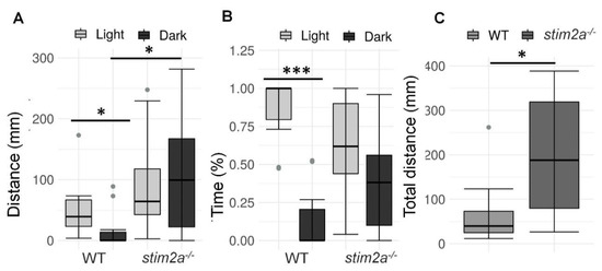 We then investigated whether stim2a−/− zebrafish larvae had different light/dark preference from WT zebrafish, known as phototaxis [51]. Specifically, we analyzed the amount of time the fish spent in the light half and dark half of the Petri dish (Figure 3B). Wildtype fish traveled a longer distance (Figure 5A) and spent more time in the light zone (Figure 5B). In contrast, the stim2a−/− mutant zebrafish did not exhibit significant phototaxis and swam a comparable distance as the WT fish (Figure 5A) and spent as much time in either zone of the Petri dish (Figure 5B). Another difference between the WT and mutant fish was the overall mobility. The total distance traveled in both zones of the Petri dish was approximately four times higher in the mutant fish than in the WT fish (Figure 5C). These data suggest that stim2a deletion led to hyperactivity and lower phototaxis.