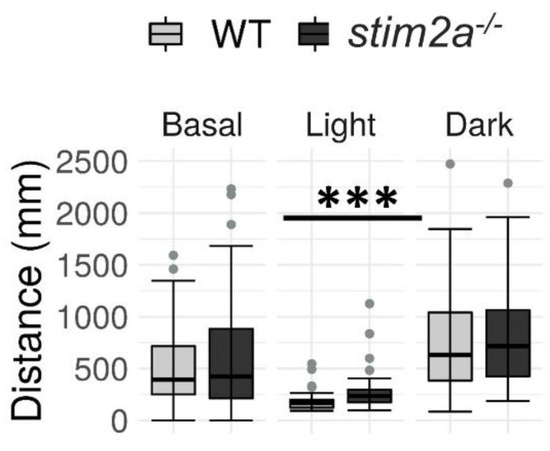 The stim2a−/− larvae reacted to changes in the light and exhibited hyperactivity during the low activity phase in the visual–motor response test. Activity was recorded during a 30 min period that consisted of a baseline phase (basal, 0% light illumination), low activity phase (light; 70% light illumination), and high activity phase (dark; 0% light illumination). Box plots show the distance traveled (in millimeters) during the respective phase. *** p < 0.001 (Wilcoxon rank-sum test). n = 53 WT larvae. n = 52 stim2a−/− larvae. Number of experiments: 6.