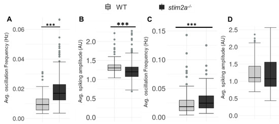 Increase in the spike frequency of neurons in stim2a-deficient zebrafish. For in vivo Ca2+ imaging, WT and stim2a−/− zebrafish that expressed GCaMP5G under the pan-neuronal HuC promoter were used. Zebrafish neurons from the periventricular gray zone of the optic tectum were analyzed. (A) Box plots show the basal level (in E3 water) average oscillation frequency (in Hz). (B) The basal level (in E3 water) average calcium oscillation amplitude (AU). Number of cells: 168 WT, 392 stim2a−/− (C) Box plots show the average oscillation frequency (in Hz) after treatment with 600 μM glutamate. (D) Average calcium oscillation amplitude (AU) after treatment with 600 μM glutamate. Number of cells: 276 WT, 166 stim2a−/−. The Wilcoxon rank-sum test was performed to compare in vivo Ca2+ responses of the brain between WT and stim2a−/− animals. Number of animals: 3 WT, 7 stim2a−/−. *** p < 0.001.