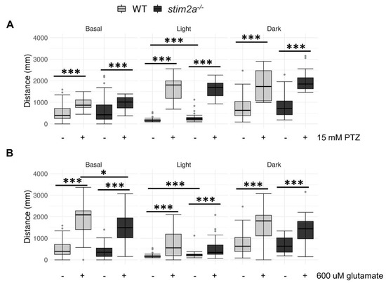 We further explored the alterations of neuronal activity, detected by in vivo calcium imaging. We administered two drugs that stimulate neuronal activity, PTZ and glutamate, and performed the visual–motor response test (see Figure 3C). Pentylenetetrazol induces seizures, and zebrafish were shown to exhibit behavioral reactions in response to this treatment beginning at 3 dpf [53,54]. Glutamate increases neuronal activity and locomotor activity [50,55]. Importantly, glutamate was shown to penetrate zebrafish larvae and reach brain neurons. Thus, the main effect of this drug on animal behavior is primarily attributable to an increase in brain activity [50,55]. We performed PTZ treatment from a lower to a higher dose [53]. At a lower dose of PTZ, we could not detect any differences in the WT compared to the mutant (Supplementary Figure S2). However, both the mutant and WT fish reacted to both 15 mM PTZ and 600 μM glutamate treatments, reflected by an increase in the distance traveled during all phases of the experiment (Figure 8). Interestingly, the mutant larvae reacted to 600 μM glutamate with a significantly milder induction of locomotor behavior during the baseline phase (Figure 8B). No difference in the distance traveled was observed between the two genotypes that were exposed to 15 mM PTZ (Figure 8A). Both WT and stim2a−/− larvae significantly increased their locomotor activity, which was the result of the occurrence of seizure-like episodes. Consistent with the results that are presented in Figure 6, we observed the most pronounced difference between the WT and stim2a−/− fish during the low activity phase under the no-treatment condition (Figure 8A,B). Both mutant and WT larvae exhibited hyperactivity and no decrease in mobility with 15 mM PTZ treatment in the light (Figure 8A). Finally, we did not observe any difference in the behavior between stim2a−/− and WT larvae during the high activity phase with either treatment (Figure 8A,B).