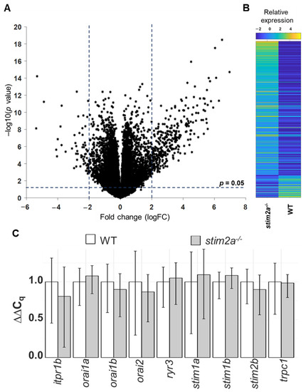 RNA sequencing analysis. (A) Volcano plot of the transcriptional differences between the stim2a−/− and WT zebrafish larvae. The logarithms of the fold changes in the individual genes (x axis) are plotted against negative logarithms of their p-value to base 10 (y axis). Positive log2 (fold change) values represent the upregulation in stim2a−/− larvae compared with WT larvae, and negative log2 (fold change) values represent downregulation. Points above the dotted line represent differentially expressed genes in stim2a−/− larvae with p < 0.05 after correction for multiple testing. (B) Heat map of a total of 392 genes that were identified as being differentially expressed (log2 (fold change) ≥ 2) between the stim2a−/− and WT larvae, including 336 upregulated genes and 56 downregulated genes. (C) mRNA levels of store-operated calcium entry (SOCE) components in 5 dpf zebrafish, quantified by qPCR.