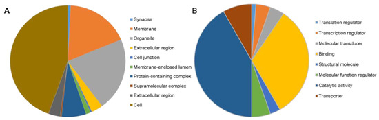 PANTHER Gene Ontology annotation analysis [58]. The distribution of gene ontology (GO) terms was categorized based on PANTHER GO-Slim. (A) Cellular Component GO terms (components of cells or extracellular) with 538 component hits. (B) Molecular Function GO terms (basic activities of a gene product at the molecular level, such as binding or catalysis) with 170 function hits.